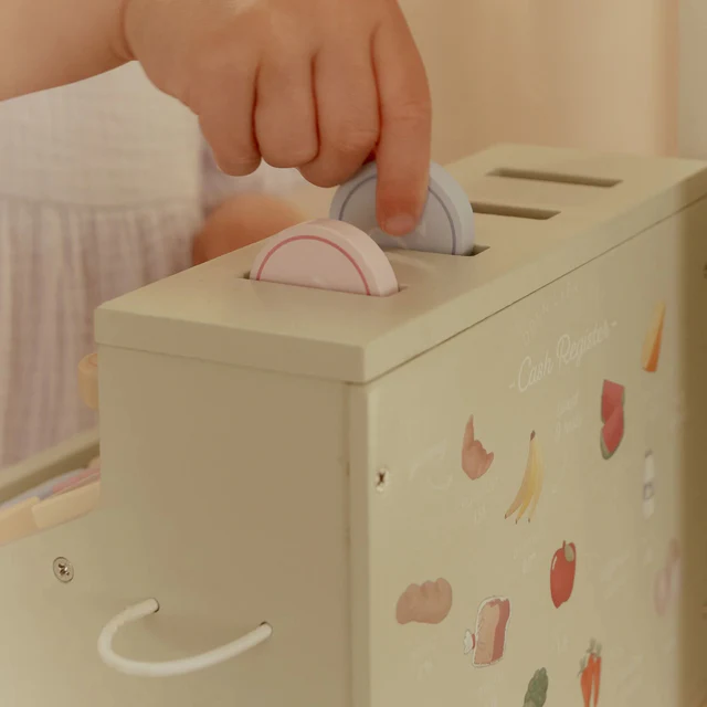Compter, scanner et payer ! Avec cette caisse enregistreuse en bois Little Dutch, jouer à la marchande devient encore plus réel. La caisse est équipée d'un scanner, d'un lecteur de carte bancaire, de boutons et d'un tiroir-caisse pour les pièces et les billets. Il y a aussi une carte bancaire incluse, permettant aux clients de payer en espèces ou par carte. Une manière fantastique de se familiariser de manière ludique avec l'argent et les chiffres. Que désirez-vous aujourd'hui ?